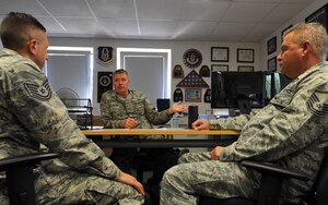 Tech. Sgt. Michael Wyne (left), a 910th Airlift Wing career advisor in training, and Master Sgt. Brian Starr (right), the career advisor for the 910th Mission Support Group, speak with Master Sgt. Billy Blair, an Air Force Reserve recruiter assigned to Spangdahlem Air Base, Germany, July 18, 2018,