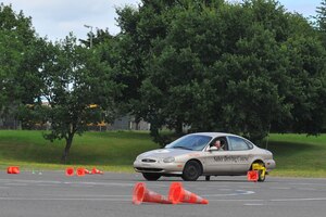 Master Sgt. Michael Riggenbach, occupational safety technician assigned to the 910th Airlift Wing, operates a Spangdahlem Air Base "Skid Monster" July 10, 2018, on SAB, Germany. While at SAB Riggenbach assisted with vehicle safety classes, part of the class was operating a vehicle meant to mimic a