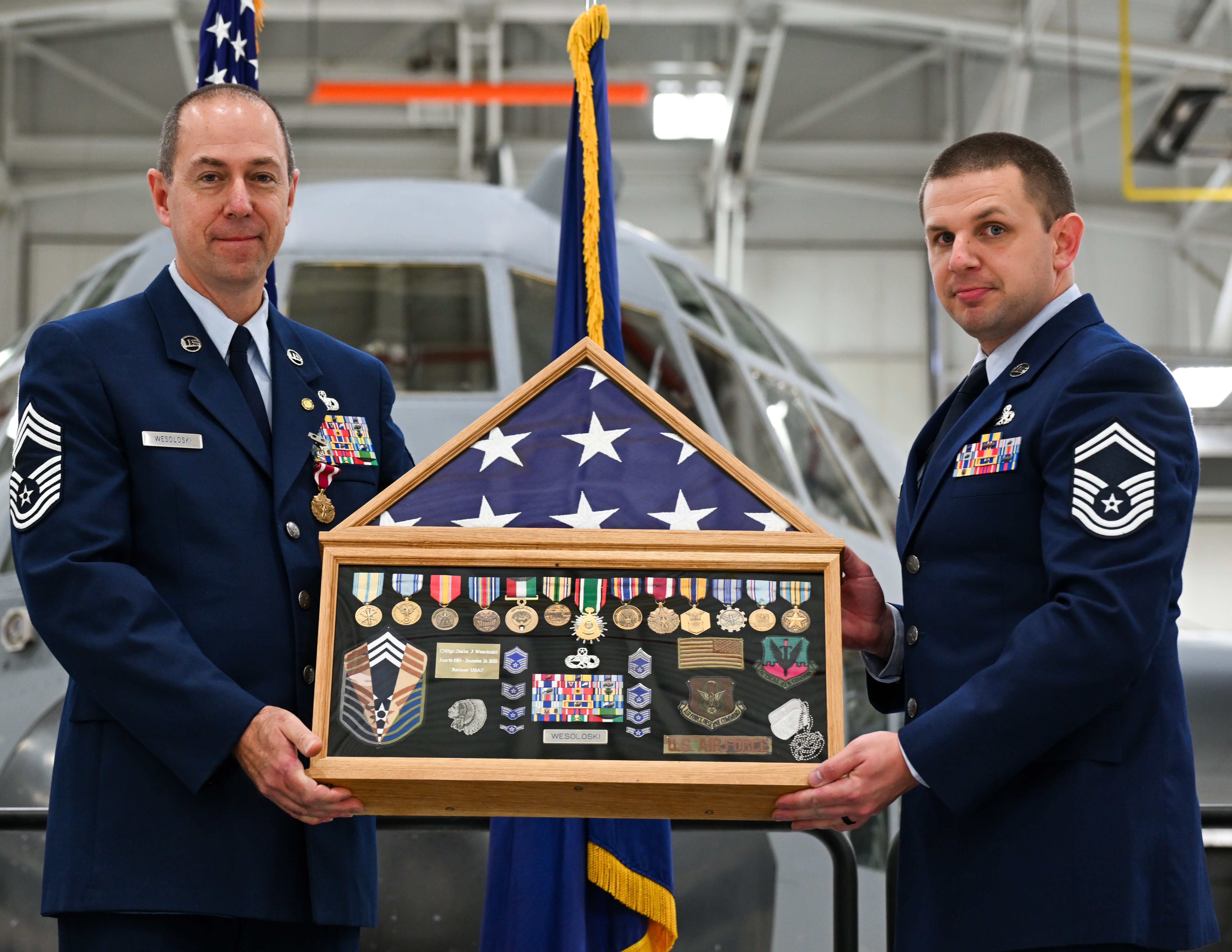 Chief Master Sgt. Darin J. Wesoloski's Retirement U.S. Air Force Logo Nov. 21, 2025 Chief Master Sgt. Darin J. Wesoloski's Retirement Retired Col. Raymond Otto speaks in front of a C-130H Hercules during a retirement ceremony for Chief Master Sgt. Darin J. Wesoloski, superintendent of the 910th Maintenance Squadron’s fabrication flight, seated, on Youngstown Air Reserve Station, Ohio, Nov. 15, 2025. Chief Master Sgt. Franco Russo, chief enlisted manager of the 910th MXS, inner left, and Andy Ford, a civilian in the 910th Airlift Wing’s safety office, also spoke during the ceremony. Wesoloski retired after 36 years of service in the United States Air Force. (U.S. Air Force photo by Staff Sgt. Dylan Bigelow) Details Download Chief Master Sgt. Darin J. Wesoloski's Retirement Chief Master Sgt. Darin J. Wesoloski, superintendent of the 910th Maintenance Squadron’s fabrication flight, right, receives his certificate of retirement from retired Col. Raymond Otto during a ceremony on Youngstown Air Reserve Station, Ohio, Nov. 15, 2025. Wesoloski retired after 36 years of service in the United States Air Force. (U.S. Air Force photo by Staff Sgt. Dylan Bigelow) Details Download Chief Master Sgt. Darin J. Wesoloski's Retirement Chief Master Sgt. Darin J. Wesoloski, superintendent of the 910th Maintenance Squadron’s fabrication flight, accepts a folded flag from the 910th Airlift Wing’s Base Honor Guard during his retirement ceremony on Youngstown Air Reserve Station, Ohio, Nov. 15, 2025. Wesoloski retired after 36 years of service in the United States Air Force. (U.S. Air Force photo by Staff Sgt. Dylan Bigelow) Details Download Chief Master Sgt. Darin J. Wesoloski's Retirement Chief Master Sgt. Darin J. Wesoloski, superintendent of the 910th Maintenance Squadron’s fabrication flight, receives the Meritorious Service Medal from his wife, Michele Wesoloski, during his retirement ceremony on Youngstown Air Reserve Station, Ohio, Nov. 15, 2025. Wesoloski retired after 36 years of service in the United States Air Force. (U.S. Air Force photo by Staff Sgt. Dylan Bigelow) Details Download Chief Master Sgt. Darin J. Wesoloski's Retirement Chief Master Sgt. Darin J. Wesoloski, superintendent of the 910th Maintenance Squadron’s fabrication flight, left, and Senior Master Sgt. Matthew J. Smith, fabrication flight chief, present Wesoloski’s shadow box during his retirement ceremony on Youngstown Air Reserve Station, Ohio, Nov. 15, 2025. Wesoloski retired after 36 years of service in the United States Air Force. (U.S. Air Force photo by Staff Sgt. Dylan Bigelow) Details Download Chief Master Sgt. Darin J. Wesoloski's Retirement Chief Master Sgt. Darin J. Wesoloski, superintendent of the 910th Maintenance Squadron’s fabrication flight, right, and retired Col. Raymond Otto bow their heads during an invocation at the chief’s retirement ceremony on Youngstown Air Reserve Station, Ohio, Nov. 15, 2025. Wesoloski retired after 36 years of service in the United States Air Force. (U.S. Air Force photo by Staff Sgt. Dylan Bigelow) Details Download Chief Master Sgt. Darin J. Wesoloski's Retirement Chief Master Sgt. Darin J. Wesoloski, superintendent of the 910th Maintenance Squadron’s fabrication flight, presents a certificate to his son, Brett Wesoloski, during the chief’s retirement ceremony on Youngstown Air Reserve Station, Ohio, Nov. 15, 2025. Wesoloski retired after 36 years of service in the United States Air Force. (U.S. Air Force photo by Staff Sgt. Dylan Bigelow) Details Download Chief Master Sgt. Darin J. Wesoloski, superintendent of the 910th Maintenance Squadron’s fabrication flight, retired after 36 years of service in the United States Air Force.