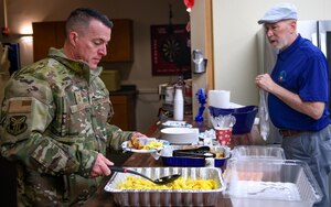 Senior Master Sgt. John Davis, first sergeant assigned to the 910th Aircraft Maintenance Squadron, plates his breakfast as Jim Naughton, director of the Military and Family Readiness Center, sets out silverware, Feb. 3, 2023, at Youngstown Air Reserve Station, Ohio. Military and Family Readiness