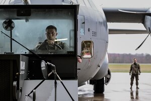 Tech. Sgt. Creston Shirey, an aircraft maintenance craftsman, tows a C-130J-30 Super Hercules on the flightline at Youngstown Air Reserve Station, Ohio, April 6, 2025. Shirey worked with fellow Citizen Airmen to move the aircraft in preparation of an assumption of command ceremony for the incoming